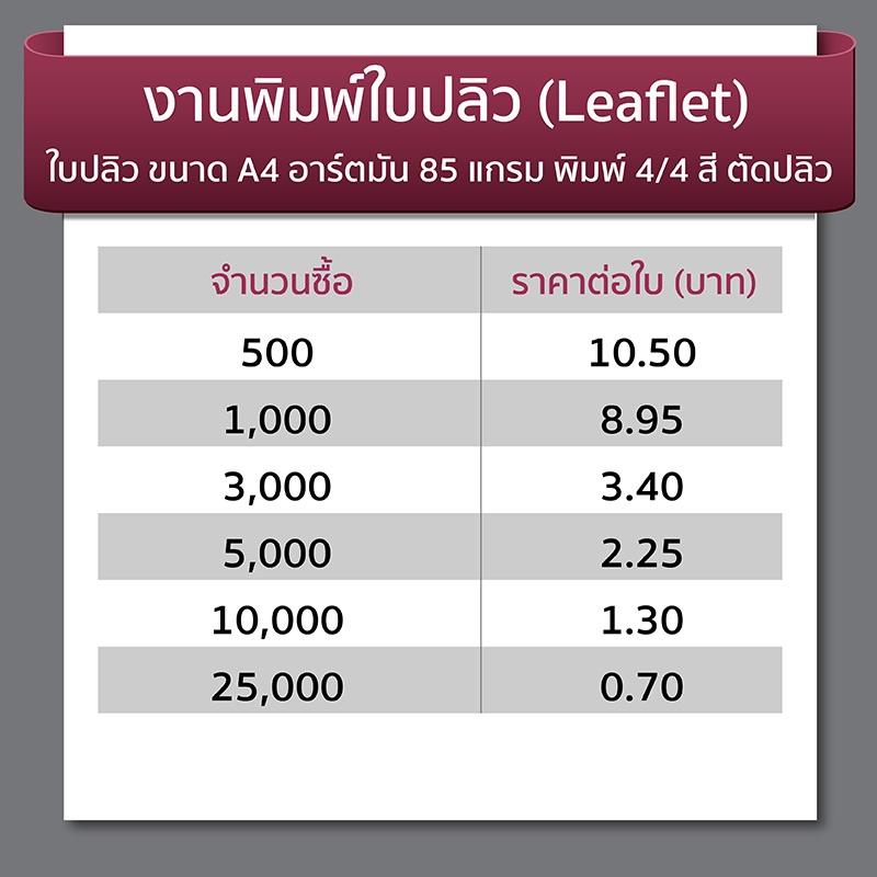 ราคา และ สเปคงาน = ใบปลิว ขนาด A4 อาร์ตมัน 85 แกรม พิมพ์ 4/4 สี ตัดปลิว